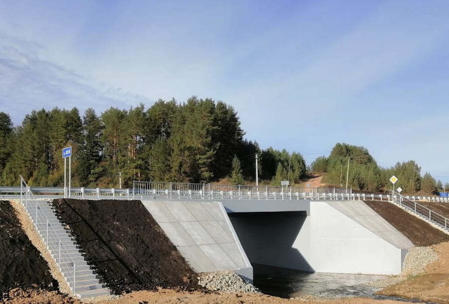 В процессе ремонта специалисты подрядной организации возвели монолитную железобетонную рамную конструкцию и входной оголовок. Провели работы по укреплению русла, выполнили гидроизоляцию. В качестве покрытия вместо традиционного асфальтобетона на сооружении использован фибробетон, что позволит продлить срок эксплуатации благодаря высоким показателям износостойкости. Установлено барьерное и перильное ограждения.